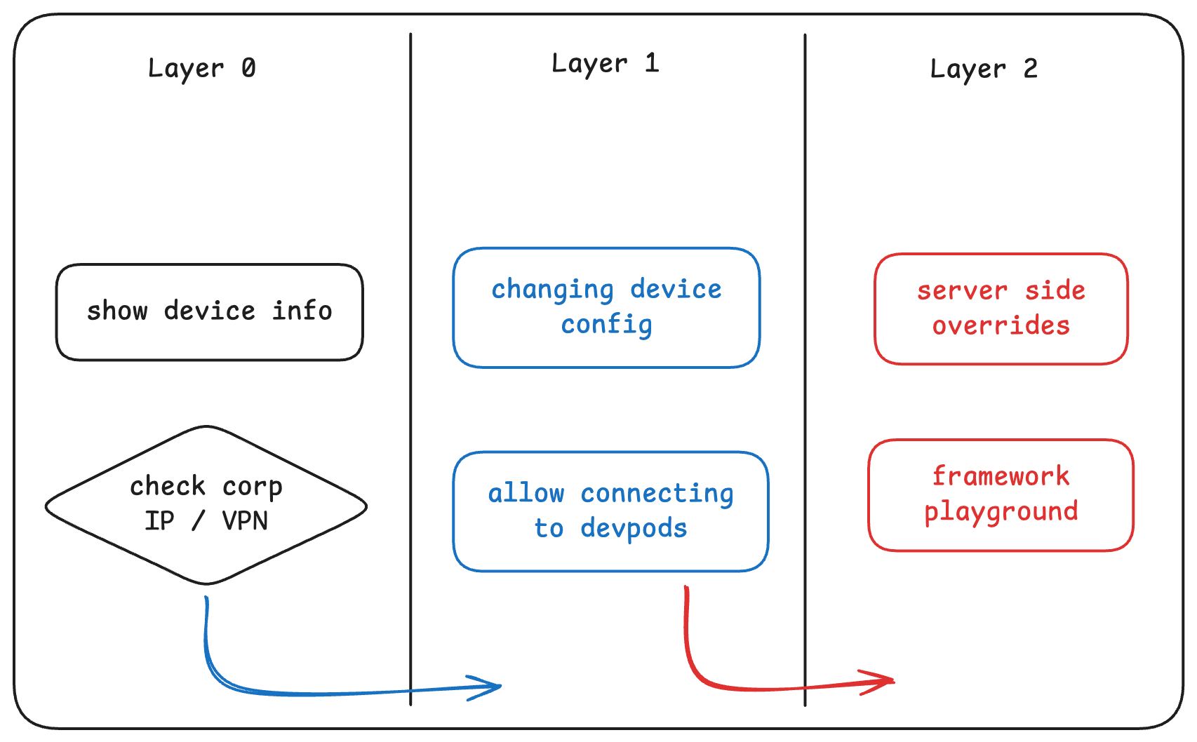 I started with a simple security layer idea like this. Not everything is “super sensitive” and requires the highest level of security check to be accessible. Something like “show debug info” that prints out information about the device / app isn’t exactly sensitive while still extremely valuable for debugging. (Keeping it away from showing to users prevents unnecessary confusion.) This also allows for progressive increments in security access pass to gain more access. For eg. you need to be on corpnet / VPN to access the dev pod connector; once connected, you’re now “promoted” to dev pod access level.
